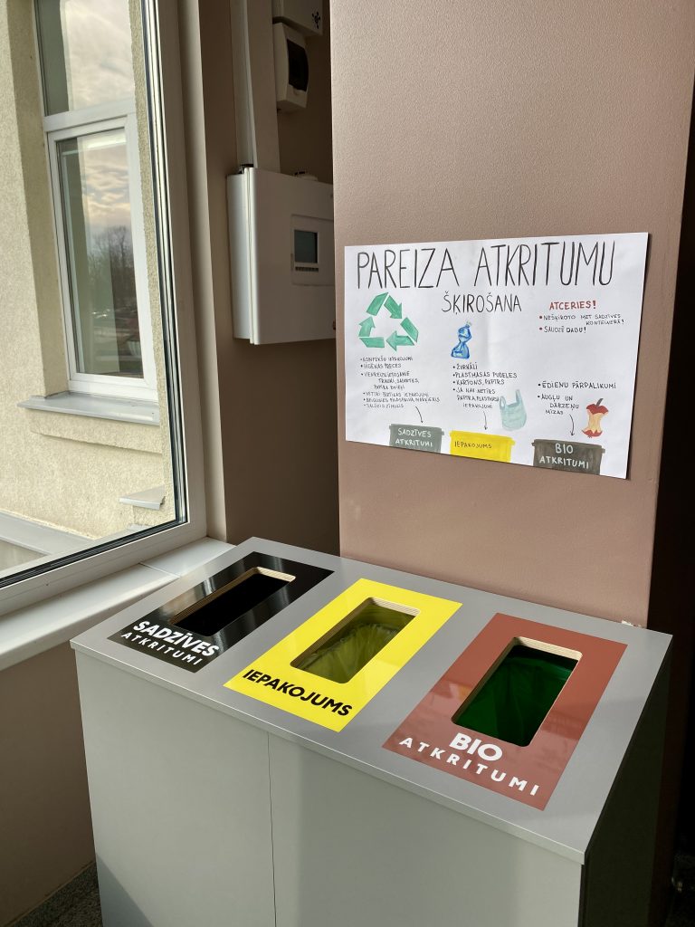 Pēc politikas pulciņa “Jaunie eiropieši” iniciatīvas skolā izvietoti divi šķirotu atkritumu konteineri – sadzīves, papīra un bio atkritumu šķirošanai. Šobrīd šie konteineri atrodas vestibilā un vecā korpusa 3. stāvā.