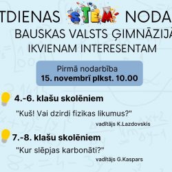 📢 Uzaicinājums visiem novada skolēniem! Aicinām Tevi piedalīties šī mācību gada pirmajā STEM nodarbībā Bauskas Valsts ģimnāzijā! 🔬🤖⚙️ Iepazīsti ķīmiju un fiziku caur aizraujošiem eksperimentiem un praktiskiem uzdevumiem. 🗓️ Datums: 15. novembris 📍 Vieta: Bauskas Valsts ģimnāzija 👩🔬 Dalībnieki: visi interesenti no novada skolām Nāc un atklāj, cik aizraujošs var būt STEM! 🚀 Nodarbību cikla “Sestdienas Read more about Aicinām uz STEM nodarbību[…]